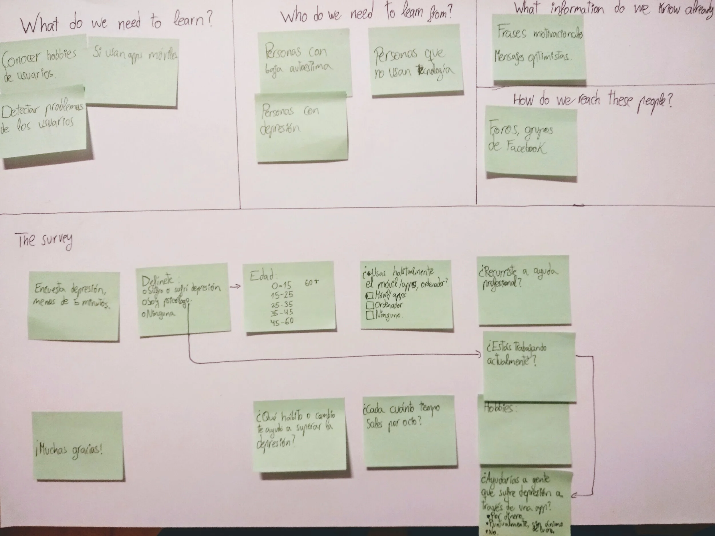One of the tools I found most useful during my research phase was the interview. I got to talk with 2 renowned psychologists, 2 psychology students and a psychologist specialized in treating children. I also interviewed 4 depression patients, 2 of them with suicide attempts in their past. All of this helped me validate my ideas and allowed me to proceed with security into the following design phases.